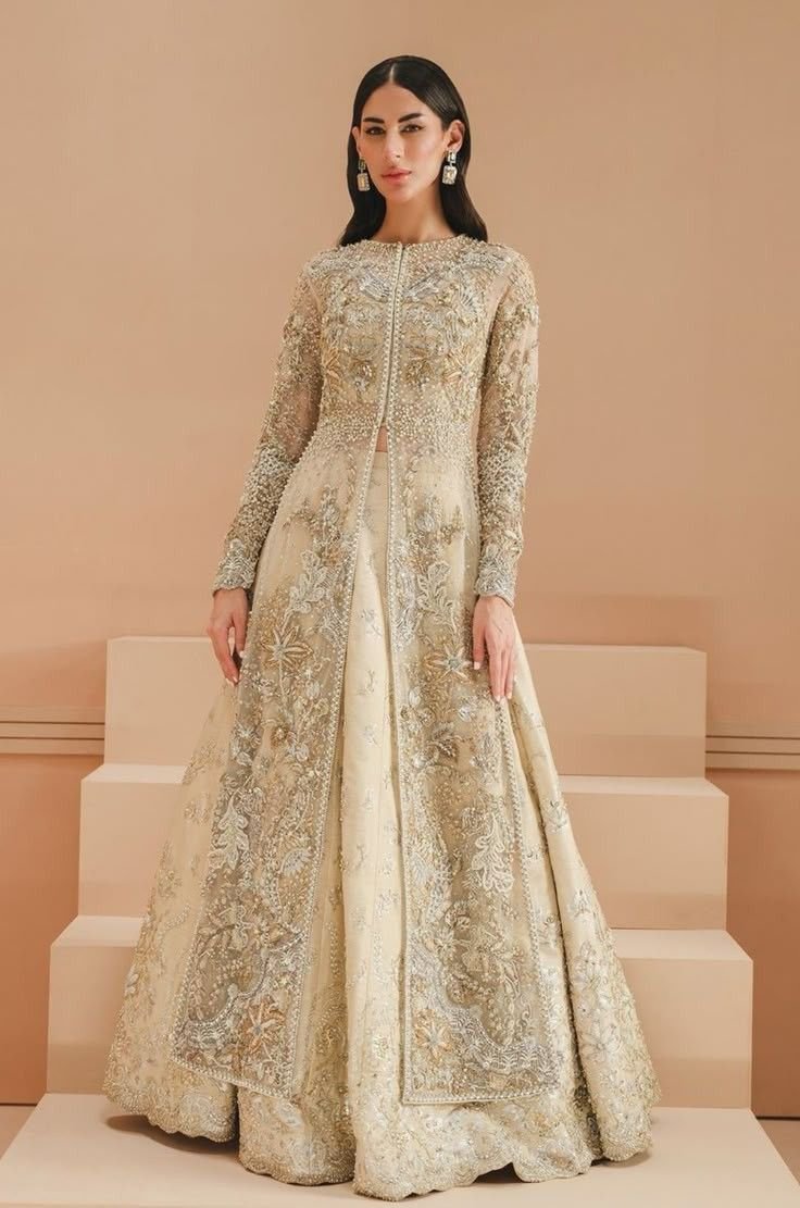 The ensemble features heavy all-over embroidery with fine threadwork, delicate embellishments, and intricate detailing that enhances its royal appeal. The long jacket-style layer paired with a matching inner outfit creates a sophisticated and modern bridal look. The subtle shimmer of the fabric combined with detailed craftsmanship adds depth and richness to the design.
