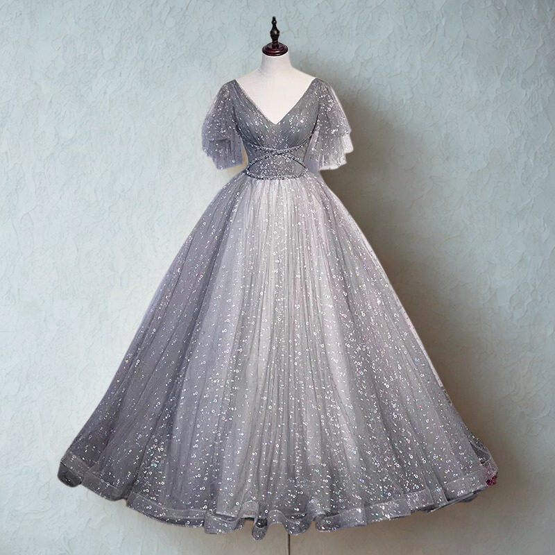 Grace meets glamour in this stunning silver-grey ball gown, designed to make you shine at every special occasion. Crafted with soft shimmering net fabric, this gown features a flattering V-neckline and delicate flutter sleeves that add a touch of elegance and charm.