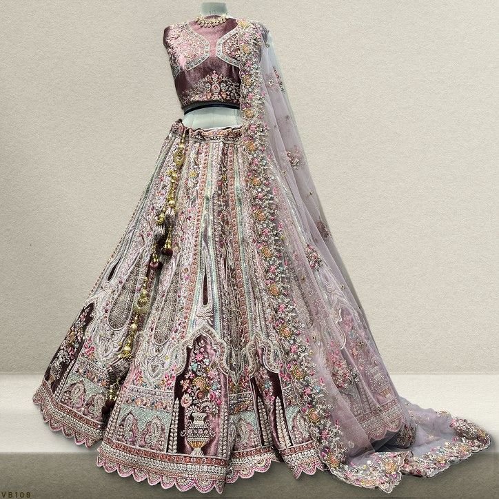 This breathtaking bridal lehenga is crafted for brides who love elegance, grace, and royal detailing. Designed in a soft pastel mauve shade, this outfit features exquisite embroidery and rich craftsmanship that make it perfect for wedding and reception wear.