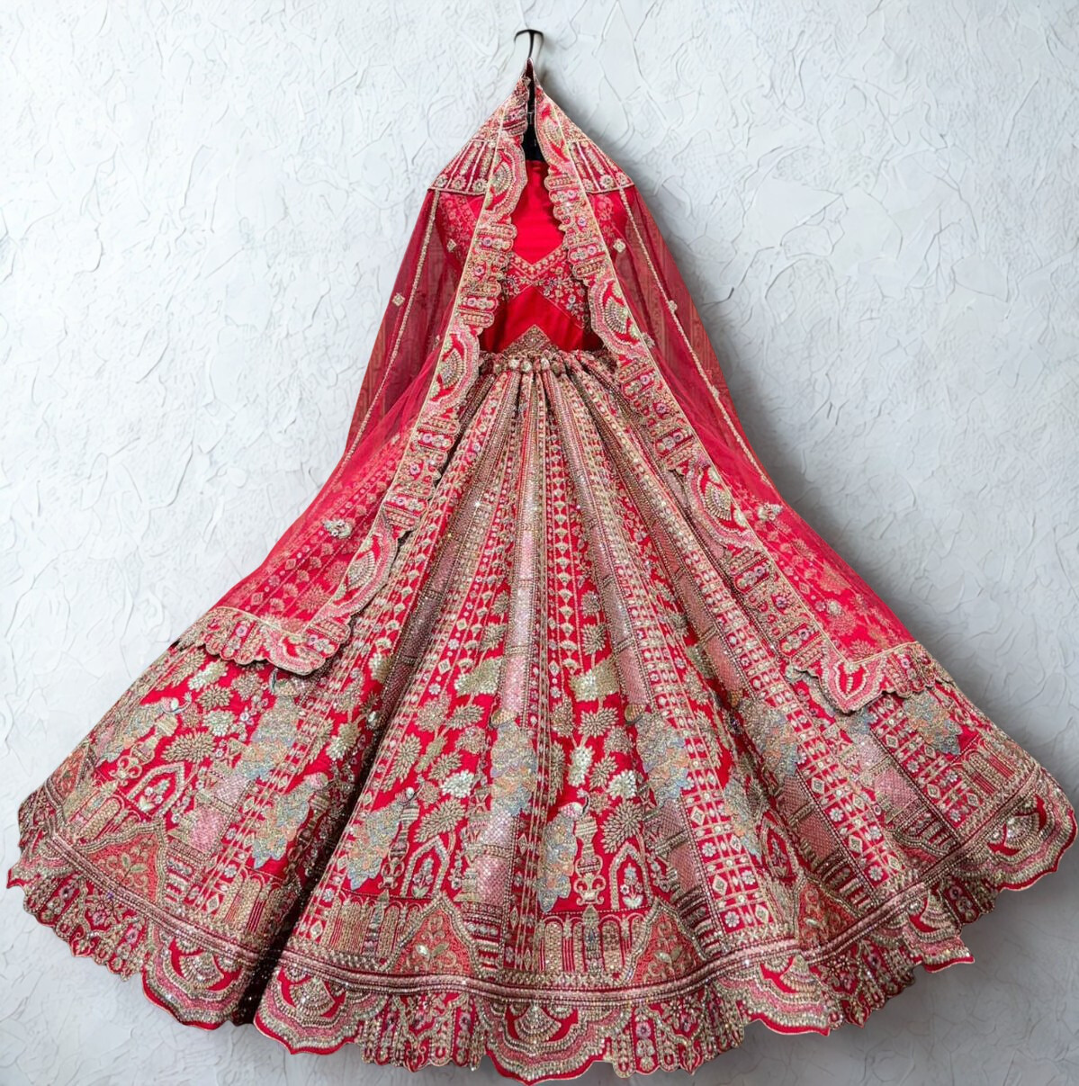 Make your wedding day unforgettable with this breathtaking red bridal lehenga, designed to reflect timeless tradition and royal elegance. Crafted with rich fabric and adorned with heavy zari, resham, and sequin embroidery, this lehenga showcases intricate traditional motifs all over the skirt.